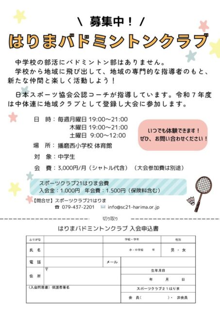 「はりまバドミントンクラブ」は「スポーツクラブ21はりま」が運営実施しています。