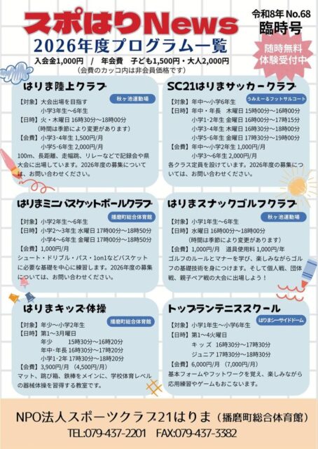 令和8年(2026年)臨時号-No.68 2026年度プログラム一覧 臨時号(表・2026年度プログラム一覧)のダウンロードはこちら 2026年度イベントカレンダー 臨時号(裏・イベントカレンダー)のダウンロードはこちら バックナンバー等ほかのスポはりNewsはカテゴリー「スポはりNews」をご覧ください 2026年2月24日スポはりニューススポはりニュースの令和8年臨時号を発行しましたNew!!2025年12月24日スポはりニューススポはりニュースの令和8年冬号を発行しました2025年9月24日スポはりニューススポはりニュースの令和7年秋号を発行しました2025年6月24日スポはりニューススポはりニュースの令和7年夏号を発行しました2025年3月28日スポはりニューススポはりニュースの令和7年春号を発行しました2025年3月1日スポはりニューススポはりニュースの令和7年臨時号を発行しました
