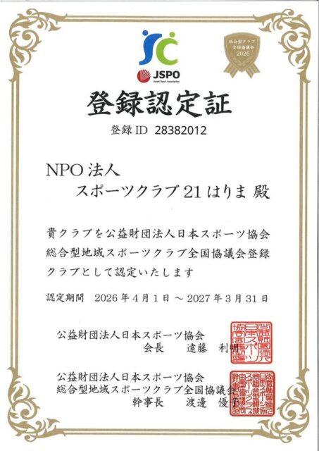 NPO法人スポーツクラブ21はりまは、毎年度、財団法人日本スポーツ協会による総合型地域スポーツクラブ登録・認証制度による登録認証を受けています。