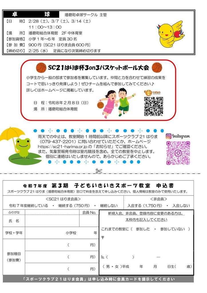 裏面の申込書に必要事項を記入の上、NPO法人スポーツクラブ21はりま事務局(播磨町総合体育館 受付 9:00~19:00)で参加費を添えて申し込みください。学校等では受付できません。播磨町外の小学生はスポーツクラブ21はりまに入会いただくと参加いただけます。