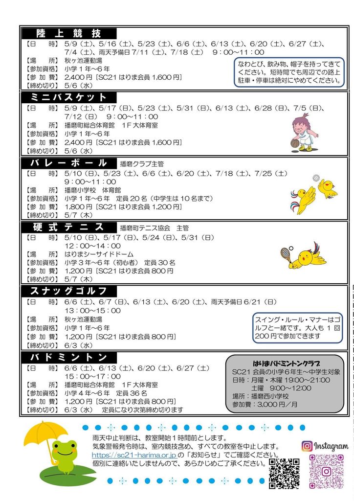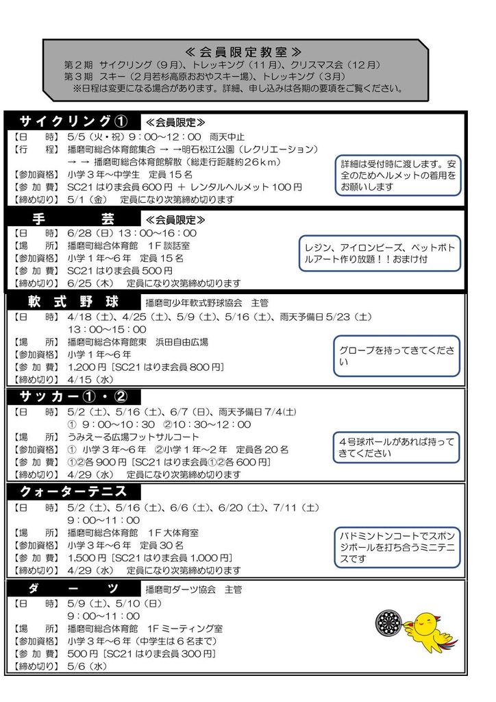雨天での中止は、教室開始 1 時間前以降にスポーツクラブ 21 はりま(079-437-2201)に問い合わせていただくか、ホームページ(http://sc21-harima.or.jp)のトップページ上部の「お知らせ(教室の開催情報等)」でご確認ください。